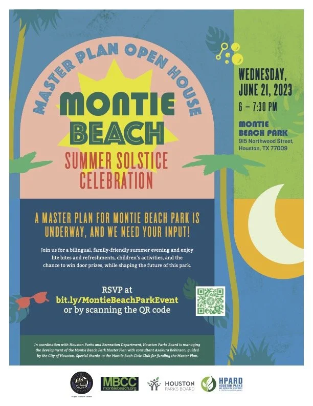 En estrecha coordinación con Houston Parks and Recreation Department, Houston Parks Board está dirigiendo el desarrollo de un plan maestro para el parque Montie Beach con el consultor de diseño Asakura Robinson, guiado por la Ciudad de Houston, con aportes de las partes interesadas, organismos públicos y organizaciones comunitarias. Un agradecimiento especial al Club Cívico de Montie Beach por la recaudación de fondos para el plan maestro.